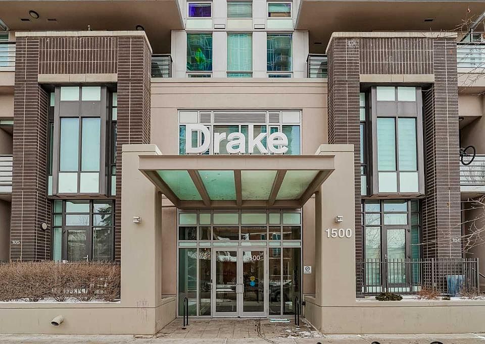 Welcome to this gorgeous 1 bedroom, 1 bathroom condo in one of Calgary's most desired buildings, The Drake. This home really does have it all with 492 square feet of living space and an ABSOLUTELY MASSIVE TERRACE. As you walk in you are greeted with beautiful dark wood floors throughout the home starting with your kitchen, equipped with stainless steel built-in appliances, glass cook-top, granite counter tops, and a eat up bar area. Your kitchen flows into your living room making for a perfect entertaining space and is wrapped with floor to ceiling windows overlooking your expansive terrace. Your bedroom is large enough for all of your bedroom furniture and has a pocket door for direct access to your full bathroom. The terrace of this unit is ONE OF THE LARGEST IN THE BUILDING and is really what makes this unit special as there are only a few units that offer such a large outdoor space. This space is great for entertaining, BBQ'ing with friends and family, gardening, morning coffee or just basking in the sun. Truly a unique offering. The home comes with titled underground parking and a titled storage unit. The Drake is one of the most sought after buildings in Calgary being steps away from 17th avenue shops, restaurants, parks, pathways and not far from the river. There are great schools in the area and access to transit to get wherever you need to go in the city. Do not miss out on this opportunity to own this great home with huge outdoor space in a wonderful building.