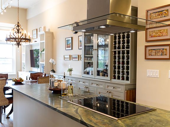 With a massive, bespoke center island including Wolf Induction cooktop with overhead exhaust, Liebherr fridge, stainless steel farmhouse sink, Bosch dishwasher, chic leatherfinished Chilean stone countertops, custom 42" cabinetry up to the ceiling w/upgraded hardware, and an extended custom built in bar with 52 bottle wine rack!