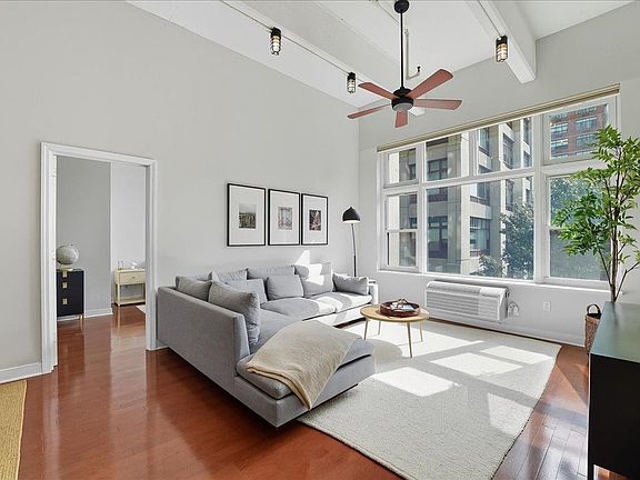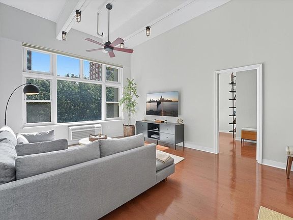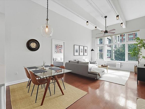 Welcome to Residence 2U at the iconic Hudson Tea Building—a meticulously renovated, turnkey 2 bed, 2 bath loft offering 1,155 sqft of luxurious living with available garage parking. This light-filled home features an ideal "butterfly" layout with soaring 14-foot ceilings, exposed concrete beams, and expansive 10-foot picture windows overlooking lush tree-lined Washington Street. The open chef’s kitchen is an entertainer’s dream, boasting white quartz countertops, a massive peninsula, 42" shaker cabinetry, stainless steel appliances, and designer finishes. Each oversized bedroom fits a king bed and includes custom blackout shades, dual closets, and attached full baths. The spa-like primary en-suite stuns with a teak double vanity, glass-enclosed walk-in shower, hex mosaic floors, Kohler fixtures, and porcelain walls, while the second bath offers a luxe soaking tub and walnut vanity with Carrara top. Additional highlights include custom hardwood and slate flooring, full-size in-unit laundry, massive attic storage, new heating and cooling units, entryway foyer complete with coat closet, and overhead lighting all on dimmers — set within one of Hoboken’s most sought-after full-service buildings.