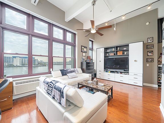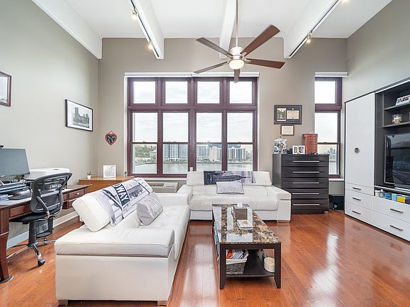 Enjoy luxury living in this large studio loft in one of Hoboken's most desirable waterfront buildings, Hudson Tea. This 735 sqft. residence has a bright open living space with 14 foot ceilings and breathtaking waterfront views of NYC from Midtown to the GW Bridge. Its updated features include pristine hardwood floors, new Hunter Douglas motorized blinds, overhead track lighting and ceiling fan. The open kitchen has pristine porcelain flooring, granite counters and stainless-steel appliances. The updated spa-inspired bath is complete with a floating vanity, glass enclosed shower with double sliding door and washer-dryer. The roomy sleeping alcove has a large custom built-in closet with additional storage above and built-in wardrobe to the right. The expansive living area is complete with a built in entertainment center providing additional storage. World-class building amenities include state-of-the-art fitness center, exclusive residents club, children's playroom, 24-hour attended lobby and complimentary shuttle service to PATH. This waterfront community is steps to Hoboken North Ferry Terminal, Trader Joes, Soul Cycle and the many fine dining and shopping options Hoboken has to offer. Nearby rental parking is available for an additional fee. Available December 1.