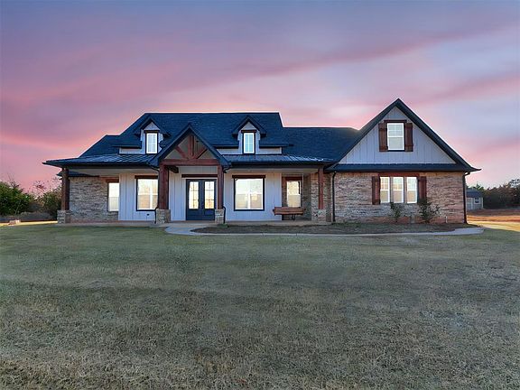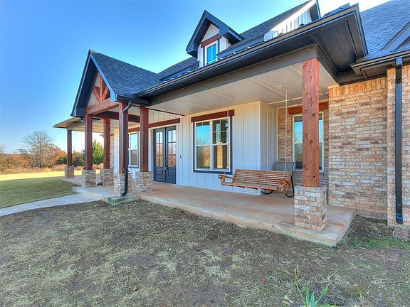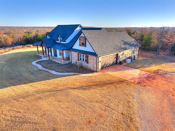 Spectacular 2 year old home on 10 acres in Norman. Open concept farmhouse design. Vast and roomy living room with vaulted wood beam ceiling, fireplace, wood floors and nice natural lighting. Kitchen is spacious with plenty of cabinets & quartz countertop space. Complete with farmhouse sink, stainless steel appliances (including a double oven), island with bar top seating, a large pantry and butler's pantry. The primary suite is delightful! Generous size bedroom with en-suite to full bathroom with free standing tub, separate shower, double vanities, private toilet, walk in closet, all perfectly connected to the laundry room for easy access. Secondary bedrooms are separated by the Jack & Jill bathroom, with double vanities and private toilet/tub area. Upstairs bonus room/flex space can be utilized in many ways. Lounging area, office space, play room, media room...use your imagination. It even has a full bathroom upstairs. You could even add a closet to convert it to a 4th bedroom. Garage is oversized for additional storage and holding the extra fridge &/or freezer. You will have peace of mind with the underground storm shelter, the Generac whole home generator and a security/ring system. Your appliances will last a lot longer with the whole house water softener/filter system. You can keep the property watered around the house with the multi-zone sprinkler system that runs off the well. Don't miss out on the opportunity to own and enjoy this wonderful home!