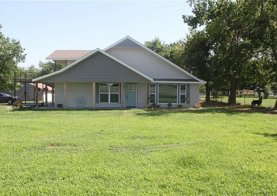 Rare find! Renovated farmhouse on 5 acres (mol) that's only 2.5 miles from Mustang. This house truly has Farm Charm! House has been rebuilt from the studs... new insulation, heat & air, electric, plumbing, windows, siding, water well, septic and everything new inside! It has an open concept floor plan with spacious rooms & lots of light. The living room is open to the dining/kitchen area and features a wood burning fireplace, vaulted ceiling and a great view with 10 ft. of extra large windows. The kitchen has new cabinets, island, appliances, countertops & backsplash. The granite countertops sparkle in the light the kitchen receives from the double windows over the sink. The laundry/mud room has plenty of room too! Lots of cabinet space and a sink for easy clean up when coming inside, it has room for an additional refrigerator and freezer or even a dog shower. If you've been looking for a beautiful farmhouse, this is a must see!