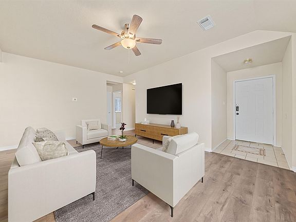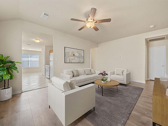 Lovely single-story home ready for move-in! This home offers a shaded front porch, 4 bedrooms, 2 full baths, 2-car attached garage, neutral paint throughout, ceiling fans, wood-type flooring in the living area, an eat-in kitchen with tile flooring and a fridge, utility room in-house, and a spacious primary bedroom with a walk-in closet. Enjoy outdoor entertaining on the back patio and manageable yard space! Conveniently located less than half a mile from the neighborhood recreation center/pool and easy access to Beltway 8, Bush Airport, I-69, Kingwood/Atascocita, shopping, dining, and more!