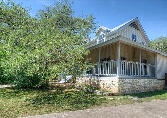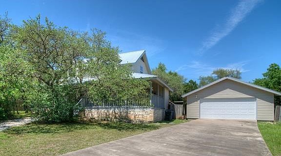 Welcome home to your Texas Ranch Home featuring a covered front porch and metal roof. Beautifully placed on this wooded lot, the trees provide both shade and privacy. Large master has sliding doors to the wood deck and back yard. Master bath oversized and bedroom has large master closet. Living, kitchen and dining open to each other making the main living space very open. Wood floors and wood ceilings help to accent the fireplace. Two bedrooms and full bath are upstairs. Don't miss detached garage!