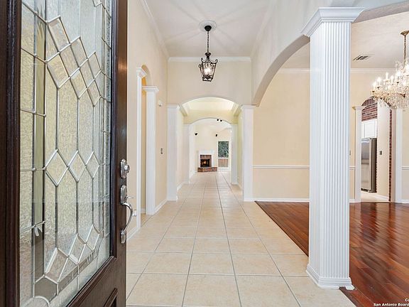 Exceptional single-story floor plan within the Springs at Sonoma Ranch, showcasing beautiful open spaces and high ceilings, and complete with a spacious study with French doors, along with a living-dining combo at the front. The gourmet kitchen features a large island with double ovens, ample cabinetry, and brand new stainless steel microwave, dishwasher, and refrigerator. The kitchen opens to the family room with a wood-burning brick fireplace. The large master suite includes his and her closets, and there are three spacious guest bedrooms. The serene outdoors is complete with pristine landscaping and a large covered patio, perfect for relaxing in the evenings and offering immense privacy from the premier greenbelt lot. Prime location within walking distance from exemplary Beard Elementary and Garcia Middle schools and easy access to the medical center, Fiesta Texas, La Cantera, UTSA, Loop 1604, and IH-10. Newley replaced garage door and motor.