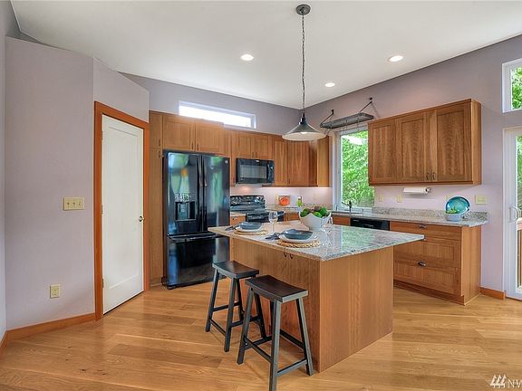 Splendid contemporary home in coveted West Oly neighborhood! Stunning new kitchen/dining, w/sliding door to west yard, soaring ceilings, hardwood floors/wool carpet, updated windows. Pocket French doors from kitchen to LR. Use your imagination w/main floor laundry/flex space (W/D hookup also in lower level). Lower level (has radiant heat) bonus rm w/french doors & bedroom w/half bath. Corner lot boasts fruit trees, garden space, more berries than you can count, custom playhouse and garden shed.