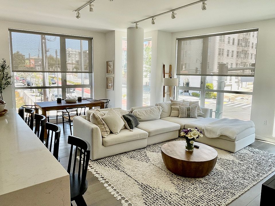 Located in one of San Francisco's most coveted neighborhoods, Cow Hollow, at the crossroads of the Marina and Russian Hill, is this newer construction boutique 27 unit elevator building with lounge-like lobby and fireplace, and a stunning rooftop terrace with two BBQs, outdoor dining and lounge, and a linear fire pit and an amazing view of Golden Gate Bridge. Enter the apartment and you are greeted by high end finishes including European Oak wide-plank hardwood floors leading to a dramatic open floor plan with floor to ceiling glass in this corner unit. The chef's kitchen has a waterfall stone counter center island with bar seating, Bertazzoni gas range, and panel matching Thermador refrigerator. Master suite has a walk-in closet and spa-like ensuite bathroom with marble counter and double vanity and deep soaking tub. Private covered balcony, in-unit washer/dryer, storage, and one car parking. One block from all the amenities of Union St. and upper Polk St. (walkscore 99). Included in rent: Garage parking, internet, heating, garbage, and water.