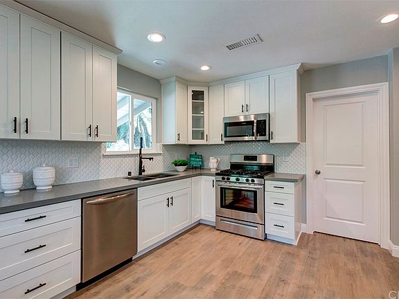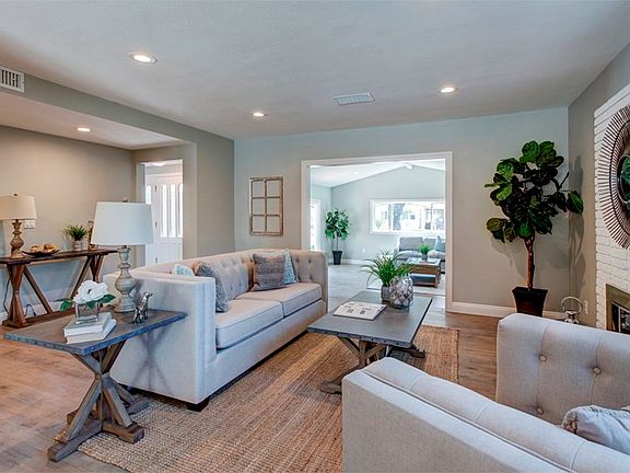 Highly upgraded and professionally designed modern single level four bedroom two bath home with a brick courtyard entrance. This home has just gone through a complete remodel. Upgraded flooring, upgraded baseboards, new dual pane windows, new dual pane sliders and recessed lighting throughout the home. The kitchens offers stainless steel appliances, upgraded stone counter tops, custom back splash, view of the backyard and brand new custom cabinets. Highly desired open concept layout where the living room is open to the dining area which is open to the kitchen. Large family room off the the living room. Ample natural light flows through out the home. Master bedroom offers a highly upgraded en suite with modern touches. The backyard has a covered patio perfect for entertaining and a grass area. Nearby is dining, entertainment, shopping this house is a must see. Don't miss the two car garage and check out the virtual tour.