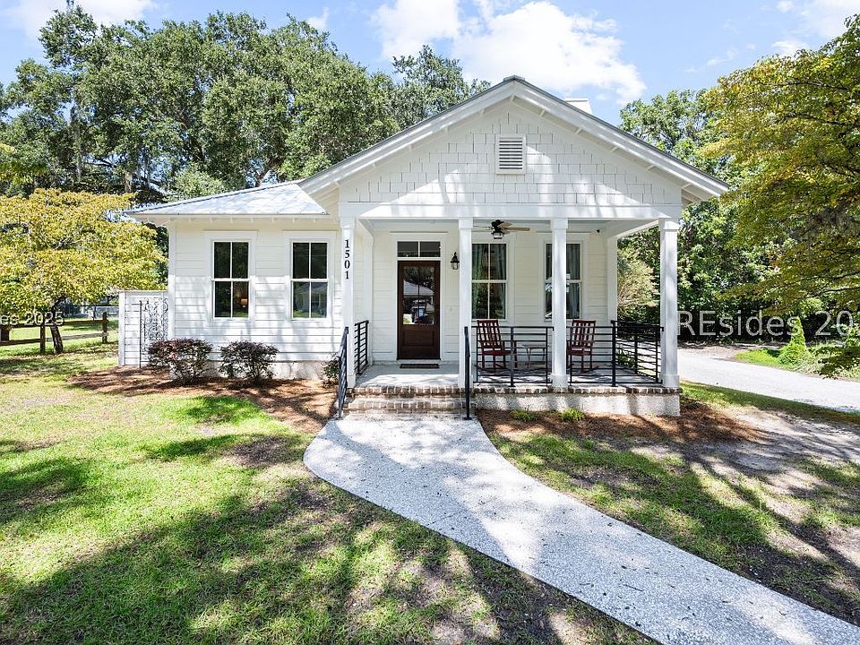 This charming Allison Ramsey designed 2-bedroom, 2-bath home sits on a spacious corner lot surrounded by majestic oak trees and blooming dogwoods. Located in the highly desirable Pigeon Point area of Beaufort, this property offers both charm and convenience. Enjoy easy access to the Pigeon Point boat landing, playground, county tennis courts, and the scenic 10-mile Spanish Moss Trail all just minutes away. Beaufort Memorial Hospital, USCB, and downtown Beauforts shopping and dining are just a short walk or bike ride from your front door.The inviting yard provides ample space for outdoor entertaining and even has room for a future garage or in-law suite. With its timeless design and ideal location, this home perfectly blends Lowcountry charm with everyday convenience. Seller is related to listing agent.