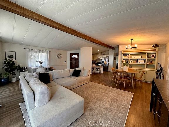 Welcome to El Rancho Verde Mobile Home Park, a vibrant all-ages community with welcoming amenities, including a clubhouse, swimming pool, billiards room, BBQ area, and a car wash station. This spacious 2-bedroom, 1-3/4-bath home offers 1,344 sq. ft. of comfortable living space with cathedral beamed ceilings and newer luxury vinyl plank flooring throughout. The large primary bedroom features an en-suite master bath, while the second bedroom is also generously sized. The open floor plan seamlessly connects the spacious living room, dining area with built-in hutch, and a kitchen equipped with ample cupboards, a pantry, and a breakfast bar. Enjoy relaxation on the enclosed front porch, overlooking the nicely landscaped yard. The private, fenced backyard is perfect for pets or unwinding outdoors. Parking is effortless with a covered 3-car carport, plus a large storage shed with workspace and tool storage. Recent upgrades include a newer roof, updated plumbing, water heater, LVP flooring throughout, and interior paint. Upon entering from the covered porch, you're greeted by an expansive living and dining room combination. To the left, the open kitchen comes complete with a newer freestanding oven range and newer dishwasher. Down the hallway, you'll find a laundry area, a full bath with shower/tub, additional closet storage, and access to the covered carport. The hallway leads to the large master suite with private bath on the left and a spacious second bedroom on the right. Nestled in a prime location, this rent-controlled community covers sewer, trash, and access to all park amenities. Residents pay separately metered utilities (water, gas, electric). Conveniently situated near shopping, restaurants, entertainment, dog parks, hiking trails, beaches, Harbor College, Kaiser, Rolling Hills Preparatory School and easy freeway access. This is truly a wonderful place to call home.