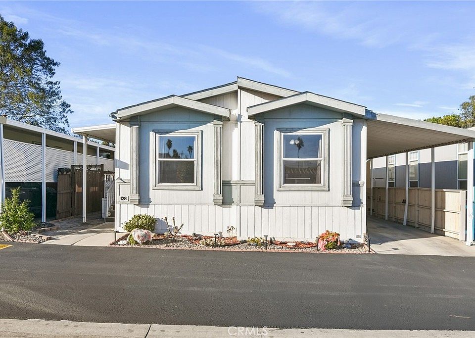 This move-in ready, turnkey 3-bedroom, 2-bath manufactured home in El Rancho Verde Mobile Home Park offers just under 1,200 sq. ft. of comfortable living space. The open floor plan welcomes you with cathedral vaulted ceilings, newer vinyl flooring throughout, fresh interior paint, and accent attached furniture — great for storage, a coffee area, or bar setup. The spacious primary bedroom features its own en-suite bath, while the additional bedrooms are generously sized — perfect for family, guests, or a home office. Enjoy relaxing on the lovely front porch or in the private, low maintenance hardscaped yard — ideal for outdoor gatherings or quiet evenings. Additional highlights include a 2-car covered carport, storage shed, central air and heat, laundry area in kitchen and a beautifully manicured front area. Located in El Rancho Verde, a vibrant all-ages, rent-controlled community offering resort-style amenities such as a pool, clubhouse, billiards room, BBQ area, and more! Conveniently located near parks, schools, shopping, restaurants, and freeway access — this home is ready for its new owners to move in and start making memories!