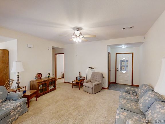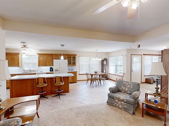 This beautiful Custom built home is move in ready! The "One owner" home has been well cared for and maintained, and some of the rooms have been freshly painted. It has a wonderful open concept with handicap accessible doors and hallways. The kitchen offers an abundance of cabinet space with pull out drawers, and large center island perfect for meal preparation or family dining. There's a nice sitting area off of the kitchen that provides extra space for so many different possibilities. It is surrounded by wonderful windows allowing the natural light in. These all have custom made blinds. The spacious primary bedroom has an ensuite bathroom, large walk in closet, and adjoining sitting area to relax in. The other two bedrooms are located on the opposite end of the house with their own full bath. Plenty of closet space in both of these rooms, one with an additional nice walk in closet. The oversized garage also has built in cabinets for added storage, and an above ground storm shelter to protect you in Tornado weather, and you don't even have to get wet getting to it! The lawn has been professionally cared for and has a sprinkler system to keep it nice and green. The house sits on a large corner lot with a fully fenced back yard There is an additional amount of back yard behind the fence line that is part of this property too. You could enlarge the back yard or fence this off for a separate area. The back yard has a storage building for lawn equipment or any extra storage you might wan. This house has so much to love about it! Schedule to see it today.