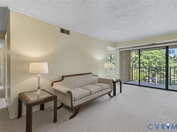This larger, well maintained 2 bed, 2 bath unit is located on the top floor, so no worries about people walking above! With low Henrico County taxes, purchasing this condo is less expensive than most rentals. All formal rooms and bedrooms have brand new wall to wall carpeting, ceramic tile in both baths, and an entry foyer and kitchen with attractive tile flooring. The kitchen has newer Stainless Steel appliances and granite counter tops and lots of storage. The living room has a sliding door leading to a private balcony to enjoy views of tree tops and the beautiful landscaping. Newer HVAC (2024) and electric water heater with all paperwork provided. Bedrooms are spacious with closet space galore! The primary bedroom has en-suite full bath with tub and shower. Stack washer and dryer convey and additional locked storage is available in the basement. There is also an office/den which is great for those who work from home. Amenities include a large pool and tennis courts, an attractive clubhouse, ample parking for owners and guests, and lovely grounds to enjoy the outdoors. The reasonable monthly dues include water, sewer, trash, recycling, landscaping, pool and clubhouse. If you need any more reasons to see this condo, the community is also pet friendly!