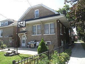 Custom built 2 unit on corner lot. First floor has large living room with deco fireplace and stained glass windows. First floor has 6 rooms, 2 bedrooms and bath. Second floor has 4 rooms, 2 bedrooms and bath. Cabinet kitchens, Basement is finished with additional bedroom and bath. Brick 2 car garage and large uncovered patio.