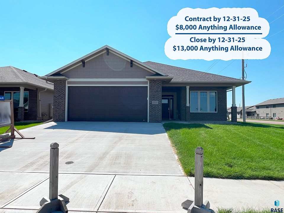 Anything Allowance available on this home if under contract or closed by 12-31-25. Welcome to this beautifully designed open-concept villa in western Sioux Falls. Flowing effortlessly from the kitchen is a bright and airy living area, complete with large windows that bathe the space in natural light. A sliding glass door provides easy access to the outdoor space, perfect for entertaining or relaxing. The neutral beige walls and textured ceiling enhance the modern yet cozy feel of the home. Retreat to the primary suite, where comfort meets luxury. The private bathroom features a double sink vanity with a granite countertop and dark wood cabinetry, complemented by modern light fixtures and dual mirrors. A custom tile shower exudes contemporary elegance. With large white and gray marble-patterned tiles, dual built-in niches for storage, and a sleek square showerhead, this space is designed for both style and function. The small square tile flooring adds texture and visual interest, completing the spa-like experience. The HOA provides lawn, snow, and garbage services. Incl lawn and sprinklers.