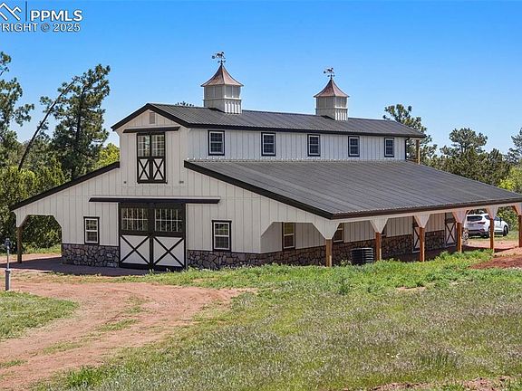For those seeking a stunning and functional executive horse estate, this property will surely suit your needs. Red Rock Sterling Ranch is located 20 minutes southwest of Colorado Springs within the prestigious gated community of Turkey Canon Ranch Estates. Tucked up against the mountains, this area abounds with natural beauty and vistas of mountain peaks and red rimrock canyons. This property features a stunning 6,372 square foot home set on 35.01 acres adorned with trees, scrub oak and open meadows. Offering the convenience of main floor living, the residence includes a five bed and six bath floor plan. The main floor primary suite is a true retreat, complete with a fireplace, sitting area, walkout to (2) decks, his/her closets and a five-piece bath. The living room flows into the gourmet kitchen that includes a large island, breakfast nook, fireplace sitting area and a walkout to an expansive covered deck – the perfect spot to relax and enjoy the surroundings. The upper level contains two additional bedrooms, each with its own private bath and a walkout to a private deck. The home features a walkout basement level with an expansive gathering area, gym, two additional beds and two baths. The outdoor living area, features a large patio, hot tub, sauna, fire pit and grill area overlooking a pond and waterfall. A new 36X60 five-stall barn stands as a true highlight of the property. It features a functional drive-through design with storage overhangs and a metal roof with cupola detail. Each stall is 12x12, and the barn is equipped with electric waterers, wash rack, rubber stall mats, ample feed storage, and a secure tack room. Above the barn, there is an unfinished 12x60 space that offers potential for customization into living quarters. Additional features include a chicken coop, a kids playground and storage shed. Red Rock Sterling Ranch offers a unique opportunity for those seeking a luxurious home and exceptional equestrian facilities in a prime location.