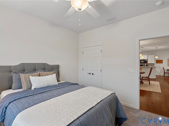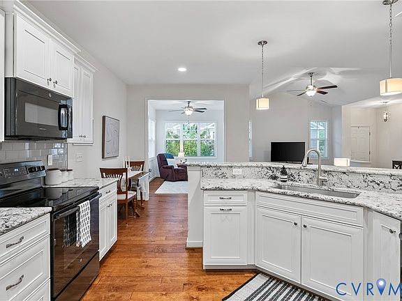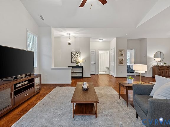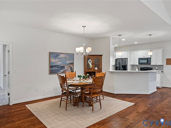 An elegant Villa for sale in Midlothian’s Premier 55+ Community, the Villas at Dogwood! Discover a beautifully maintained villa that blends comfort, style, and convenience—all just minutes from Route 288, shopping, dining, and top medical facilities. This three-bedroom, two-bath home is designed for effortless living and feels brand new. When you step inside this gorgeous home you immediately notice the vaulted ceilings in the living area and gleaming hardwood floors throughout most of the main spaces. The open floor plan seamlessly connects the living room, dining room and kitchen, creating the perfect setting for both everyday living and entertaining. The chef’s kitchen features granite countertops, tile backsplash, bar seating, and a pantry, perfectly laid out to prep meals. In addition, enjoy the sunroom off the living area that invites you to relax with a good book or a cup of coffee. The luxurious primary suite is a true retreat, complete with two walk-in closets and a spa-like bath offering a walk-in tile shower, double adult-height vanity, and tile flooring. There are two additional bedrooms that offer ample closet space and good natural light with ceiling fans and lights. Both bedrooms are adjacent to a spacious full bath and a tub/shower combination. Upstairs, an un-finished second-floor storage area for added convenience off the garage. Additional features include a two-car garage a relaxing covered front porch. Every detail showcases the quality and care that set this home apart. A welcoming 55 and over community encourages both relaxation and connection, this villa offers the perfect balance of luxury living and everyday practicality. The community offers a clubhouse with a fitness center, scenic lake, walking trails and a gazebo area to relax.