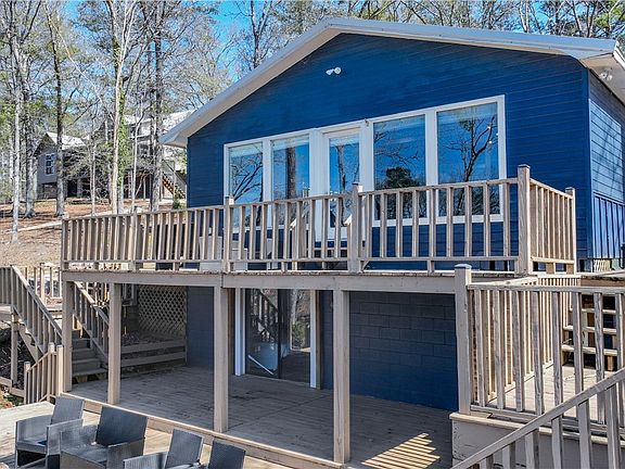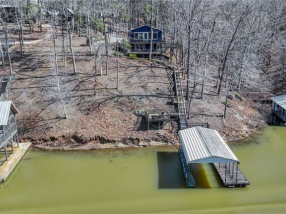 This home's total renovation was featured on Lakefront Bargain Hunt on HGTV in 2019. Situated mid way on lake in a quiet slough, this getaway is ready for your family or game day rentals. The main level features a vibrant kitchen with quartz countertops, a chic primary suite on main floor with office/bedroom. The stunning heart pine floors on the main level were taken from trees on the property! Downstairs, you'll find the second den, two bedrooms, sizeable laundry room & spacious bath. A fun piece of history- C. Jay Cox was inspired to write the classic romantic comedy, Sweet Home Alabama, after staying here as a guest of one of the previous owners! Two bedrooms downstairs both open to views of the lake. Great water views and few stairs. Boat house and three sitting areas. Beautiful lot.