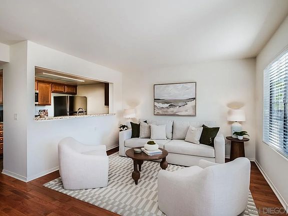 Charming ground-floor condo in Rancho Bernardo, freshly painted and move-in ready! Featuring real wood flooring throughout living areas, a cozy layout, and a private patio with peaceful mountain views. The kitchen offers a new refrigerator and new dishwasher, while the home also includes in-unit washer and dryer plus A/C for year-round comfort. Community amenities feature a pool, spa, fitness center, and clubhouse, along with plenty of guest parking. Close to shopping, dining, golf, scenic trails, and the freeway—this home offers the perfect blend of comfort, convenience, and location!