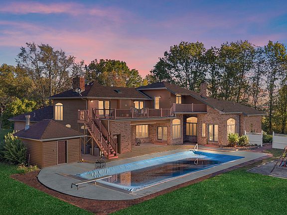 Welcome to your private retreat on 18.25 acres in Wheatfield! This stunning 7,000 sq ft brick home offers 7 bedrooms and 6 bathrooms with timeless craftsmanship and thoughtful design throughout. Enjoy beautiful hardwood floors, crown molding, and custom built-ins that add warmth and functionality to every room. The family room and primary suite each feature a cozy woodburning fireplace framed by built-in bookshelves, creating the perfect spaces to relax and unwind. The kitchen is a true standout with custom cabinets, double ovens, newer appliances, and plenty of storage -- including built-in shelves and cabinets throughout the home. A finished basement offers additional living space and even has stairs leading directly to the backyard pool area for easy access. Step outside and take in everything this property has to offer -- a 20x40 inground pool with a 12x16 bath house, dog kennel, 3.5-car garage, and carport for extra parking. For hobbyists and animal lovers, there's a 42x64 pole barn plus a 40x48 horse barn complete with stalls and pasture. A basketball hoop on a concrete court and fruit trees add to the charm of this one-of-a-kind property. Additional features include a Kinetico water softener system, updated appliances, whole house generator, and serene views from every direction. Whether you're looking for a private residence, a small hobby farm, or a space to entertain, this home has it all -- spacious, functional, and built for both comfort and connection with nature.