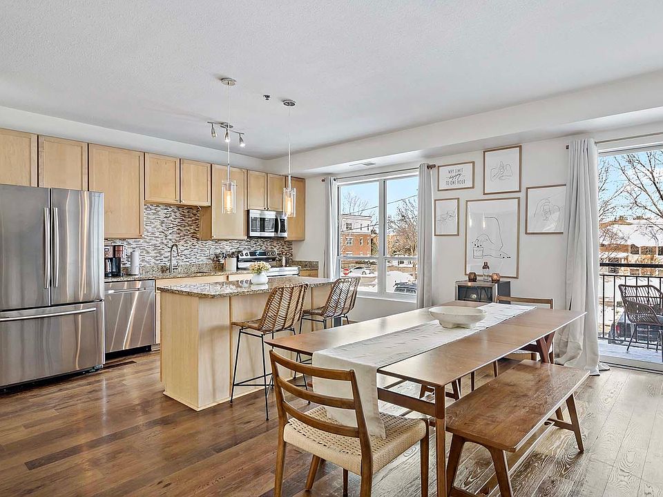 Spacious and inviting condo in a prime Hopkins location! The bright, open layout connects the kitchen and living area, with a center island, with a breakfast bar or additional seats for guests, and access to a private balcony-perfect for relaxing. The generous primary suite includes a walk-through closet and three quarter bath. French doors open to a third bedroom, currently set up as an office, offering great flexibility for your lifestyle. Additional conveniences include in-unit laundry, assigned underground heated parking (stall #7), and a storage unit just outside the building.