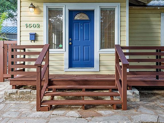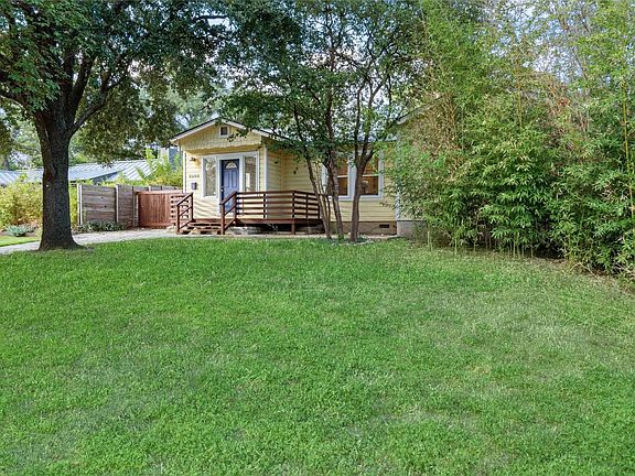 You will absolutely fall in love with this Mid-Century Modern in Austin's desired Cherrywood neighborhood. Nestled on a spacious shade tree-covered lot, this unique property has so much Austin charm, from the stone driveway to the yellow staggered shake siding to the striking cobalt blue front door, which gives this property a dazzling pop of color. You have a front porch perfect for a morning cup of coffee or a glass of wine after work. This property is not only adorable but located in an Outstanding location!! A short walk to Cherrywood Pocket Park. It is a short drive to Mueller Lake Park, Dell's Children's Hospital, main roads, shopping at Mueller, and so much more. Your living room is spacious with cool colors, wood floors, and many windows. Your living room opens up seamlessly into your dining area. You have plenty of space to set up a home office. NO CARPET! Your galley kitchen features sparkling granite, a colorful tile backsplash, and an electric cooktop stove. You have an abundance of counter and cabinet space. Above your fridge, you have storage for your favorite vintage. Your primary is spacious with a ceiling fan, wood floors, and closets. Your updated ensuite features an extended vanity with a modern sink basin and an expansive walk-in shower with tile accents. Your one additional bedroom and secondary bath features a tub/ shower combo with blue tiles and a single vanity. Relax and unwind on your back porch, host a BBQ under your covered area, or use it as a carport. This backyard is perfect for entertaining and ready for your finishing touches. NO HOA!