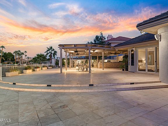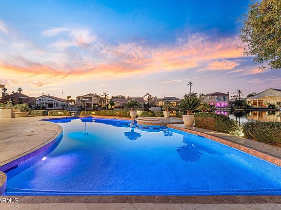 Experience lakefront luxury in the exclusive gated community of West Lake Estates at Val Vista Lakes. This modern contemporary estate offers 7 bedrooms, 8.5 bathrooms, and a 3-car garage on an oversized corner lot with captivating water views. A grand entry foyer with soaring ceilings welcomes you to interiors featuring tall bay windows framing breathtaking lake views, herringbone tile flooring, plantation shutters, quartz countertops, a waterfall island, Wolf appliances, and three Sub-Zero refrigerators—one in the kitchen and two in the catering room. Designed for refined living, the home includes a private elevator, home theater, game room with sliding glass doors, 50-bottle wine room with humidor, and an elegant primary suite with a built-in projector screen. Outdoors, enjoy year-round outdoor living with a circular driveway in front, saltwater pool and swim-up bar, outdoor kitchen, firepits, gazebo, outdoor bathroom, misting and heating systems, and remote-controlled shadesall overlooking the tranquil lake. Premier location near freeways and upscale shopping and dining at Dana Park.