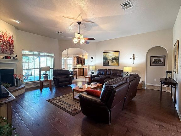 Step Into Comfort, Style & Sophistication. Welcome to this thoughtfully designed custom home — a perfect blend of elegance and practicality. With 3 spacious bedrooms, 2 full bathrooms, and a private office with French doors, this residence offers comfort, privacy, and undeniable charm. Interior Highlights: Raised ceilings create a light, airy ambiance, adding architectural drama and timeless sophistication throughout. The warm and inviting living room which flows into the open kitchen has beautiful rich wood floors and a stunning stone wood-burning fireplace with a mantle — ideal for cozy nights or effortless entertaining. The gourmet kitchen is the heart of the home, featuring sleek granite countertops, a central island, vented range hood, and ample prep and storage space — perfect for both casual meals and culinary creations. Retreat to your serene primary suite, where raised tray ceilings and natural light set the tone for relaxation. The spa-like en-suite bath includes a separate garden tub and walk-in shower, dual sinks and his/her walk-in closets. Spacious secondary bedrooms are thoughtfully designed with ample closet space — ideal for family, guests, or flexible living arrangements. Exterior Features: The home’s striking brick exterior with stone accents wraps nearly the entire structure, offering classic curb appeal, insulation, and long-lasting durability. The property also includes double pane windows, a sprinkler system and recent water softener. Step outside to your covered patio oasis — a large, shaded space ideal for morning coffee, evening wine, or simply taking in the peaceful views of a heavily wooded ranch. Last but not least, you will have extra storage in the hand built garden shed, a perfect spot for tools, lawn equipment, or seasonal décor. This home isn’t just a place to live — it’s a place to love.