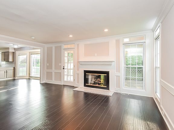 Step inside to discover dark LVP floors and a stunning two-story vaulted ceiling that creates an open, airy feel. The formal dining room features elegant trim detail and a chandelier, perfect for special gatherings. The main living room centers around a white mantel framed by windows, with built-in shelves, wall panel detailing, and a glass door that opens to the expansive back deck.