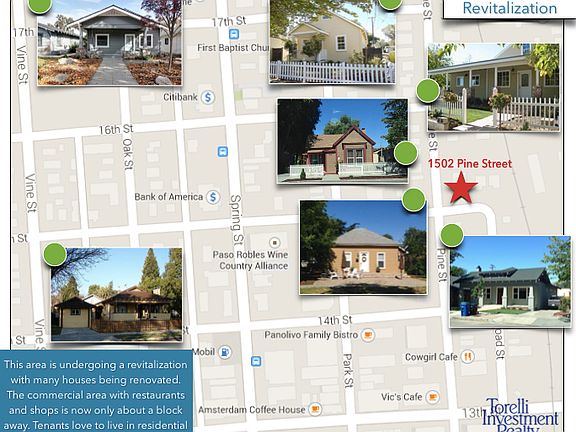 Seller just raised rents substantically; 4.5% Cash Flow at close and rents still 20% under market. Walk to City Park in Downtown Paso Robles. 6 two bedroom one bath units and 3 one bedrooms making 9 total units. Vaulted ceilings in upstairs units. All units have the bedrooms located up a few stairs which creates great zones and separate spaces. See attached Marketing Package for all info including financials and photos. 2 garages and 7 carports; the remaining 7 could easily be converted into garages. Separately metered gas and electric. One laundry room with leased machines; two washers and two dryers. Corner of 15th & Pine Street three blocks north of City Park in a residential setting. This neighborhood is being revitalized; old homes being renovated and the commercial area has expanded to one block away from this property.