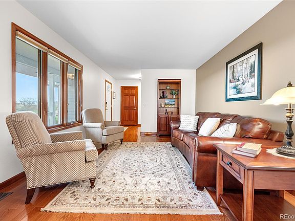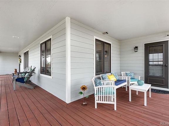 Seize the chance to own this stunning farmhouse, perfectly situated on 3.4 acres in the sought-after Wadley Farms III community. This home boasts a grand deck and patio, ideal for basking in the magnificent mountain vistas. The kitchen is a culinary haven, outfitted with stainless steel appliances, luxurious granite countertops, and a cheerful breakfast nook that effortlessly transitions into the bright and welcoming family room. Large west-facing windows offer sweeping mountain views, inviting you to unwind with a front-row seat to the vivid Colorado sunsets. Enjoy these astonishing views further from the side patio.