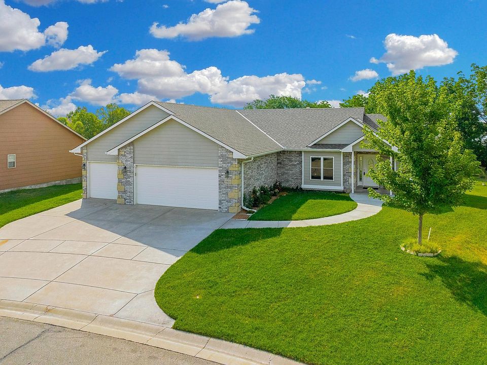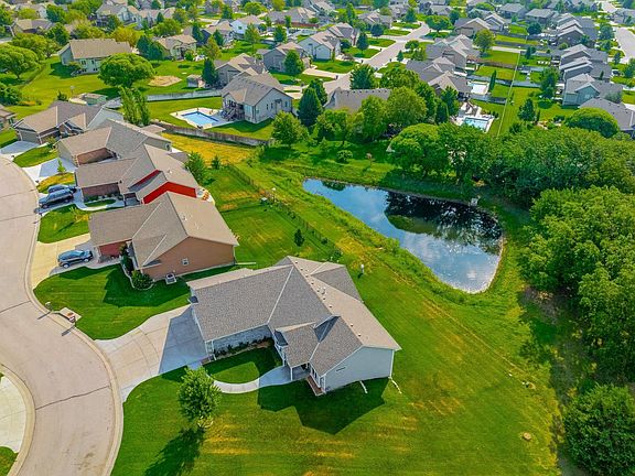 Welcome to this lovely 4 bed, 3 1/2 bath, 3 car garage, no-step entry home nestled on a scenic wooded pond view lot! One owner home. From the moment you step inside, you'll see this residence has been immaculately cared for. Gorgeous engineered wood floors, tall ceilings, & an abundance of windows and natural light pouring in from the outside enhance the home's beauty. The residence features easy open blinds, built-in blinds in the doors, and a significant upgrade with a brand new high-efficiency air conditioning system installed in July 2024. The kitchen is vast with staggered countertops, an eating bar, a large walk-in pantry, solid Maple wood cabinetry, two lazy Susans, pull-out drawers, baking sheet storage, an island with an oversized black Swanstone sink, and all appliances are included. There's even a new ice maker in the refrigerator. Don't miss the drop zone and half bath off the garage and laundry area. This home has 2 spacious bedrooms and 2 1/2 bathrooms upstairs and 2 bedrooms and a 3rd full bath downstairs. The covered deck, accessible from the kitchen and primary suite, is made of maintenance-free composite material. You'll love the private backyard with stunning water/pond views and mature trees. The primary bedroom also enjoys these great views. The primary ensuite bath is handicap accessible with a low-entry shower, separate jetted tub, grab bars, tall double vanity, large walk-in closet, coffered ceiling, brushed nickel hardware. Whole house features a neutral color scheme with white doors and white trim. Enjoy two dining options, formal dining room and informal dining area. Smart architectural design includes a mid-level walkout, offering more natural light in the basement. Enjoy the custom built wide/shallow stairs designed for ease of traversing. Another large main floor bedroom doubles as a 2nd primary suite with its own bathroom, handicap grab bars, easy step-in shower, more windows and plenty of natural light. The formal dining room features a lovely built-in glass and wood China hutch with glass shelves, backlit to showcase your decor and collectibles. There are two outdoor areas to enjoy: a concrete patio and a composite deck. The basement features view-out windows, a huge family room, two more bedrooms, and a third full bath. Three of the four bedrooms include large walk-in closets. The lower level also includes a nice-sized storage room with built-in shelving. This home is move-in ready and clean as a whistle, no pets and never smoked in. The exterior is low-maintenance with stone, brick, concrete siding, epoxy floors in the three-car garage, an oversized driveway with extra concrete, a beautiful Maple tree and rose bushes. HOA Dues include lawn mowing, irrigation system & well, winterizing and trash service. Come see the difference low maintenance life can make!
