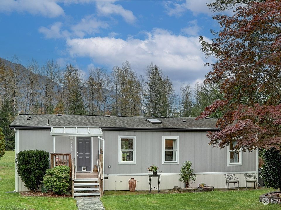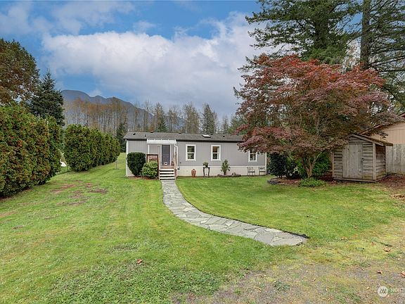 Peaceful living, minutes from Wallace Falls! This 2 bed 2 bath w/den is the perfect place to call home! With breathtaking mountain views, this home offers privacy & charm! Inside, enjoy vaulted ceilings, skylights, & an abundance of cabinetry. Updates include some plumbing & lighting fixtures, newer flooring, fresh paint (2020), & skirting (2023). The Alpine double-pane windows enhance natural light throughout. The spacious primary suite features a soaking tub, dual vanities, & a walk-in closet. Outside you will find a deck, 2 sheds, mature trees, & raised garden beds. The horseshoe driveway makes RV parking easy. Stevens Pass is just up the mountain for year round adventure. Close to schools, restaurants, shopping & Hwy 2. Welcome home!