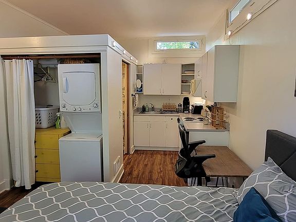 Comfy and functional studio with Kitchen, washer/dryer, small dining area and bathroom. Has a smart TV and a desk with a chair.