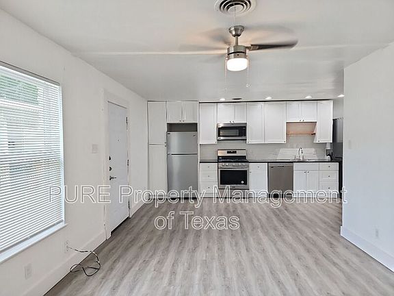 2-bedroom, 1-bath duplex featuring an open-concept living area designed for comfort and functionality. The modern kitchen comes equipped with sleek stainless steel appliances, perfect for everyday cooking or entertaining.
