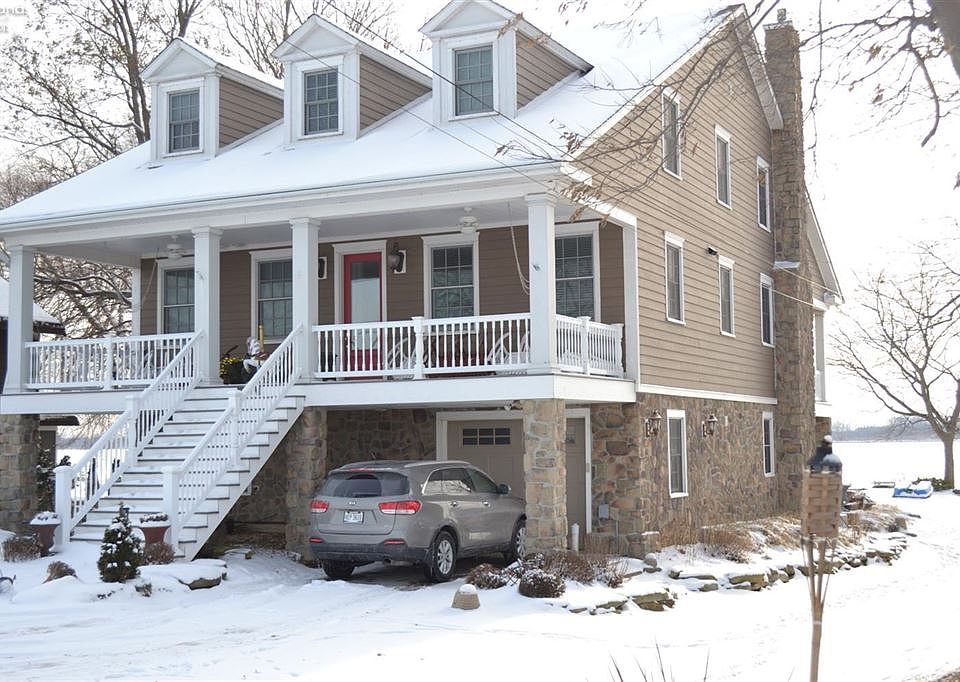 Incredible lake to bay home offers astounding views of Lake Erie and Sandusky Bay. Custom designed with all the amenities. Gourmet chef's kitchen w/professional grade stnlss appliances, custom white cabinetry, large island. Open kitchen/dng/lvng areas w/gas fpl & french doors that open out to the 33x16 covered porch overlooking the bay, 33'x16' covered front porch overlooks lake. Master suite has views of the bay with french doors open to porch. Open staircase leads to 4 more spacious bdrms w/two full Jack and Jill baths. Lower level offers the family room open to full kitchen w/snack bar complete with all appliances. With additional full bath, 24'x10 bonus room that could be a 6th bdrm, huge laundry room, this could be an in-law suite as well. This level opens out to the 33'x16' stamped concrete patio that overlooks the bay. Private boat ramp for boat/jet skis. Where else can you have your own private sandy beach in front and your own bay frontage in back for endless water enjoyment!