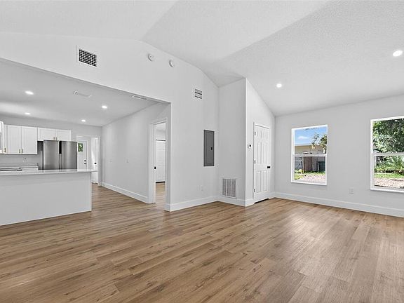 Welcome to 1503 Granite State Court — where modern design meets historic Mount Dora charm! This fully renovated home sits on an oversized 1/3-acre lot just one block off N. Donnelly Street, placing you minutes from the heart of downtown Mount Dora’s vibrant shops, lakeside dining, art festivals, and antique markets.Permitted and completed in 2024, this home underwent a total overhaul: new roof, updated plumbing, upgraded electrical, brand-new A/C, windows, and even an added bathroom. Step inside to light brown luxury vinyl plank flooring that runs throughout the home, complemented by modern shaker cabinets with stylish gold hardware.The living room boasts soaring vaulted ceilings and 4” recessed LED puck lighting, creating an open, airy ambiance. Both bathrooms are completely remodeled—one featuring a sleek walk-in shower, the other a bath/shower combo for added convenience.The upgraded kitchen includes all-new 2025 stainless steel appliances, and just off the kitchen is an oversized utility room housing the tankless water heater, washer/dryer hookups, and extra space perfect for pantry storage or a mudroom.Outside, the brand-new red brick driveway (2025) adds timeless curb appeal, and the expansive lot offers RV parking potential and plenty of room to create your ideal backyard oasis.Whether you’re looking for a forever home, a stylish seasonal escape, or an investment near one of Central Florida’s most beloved historic towns, this Mount Dora gem checks all the boxes. Enjoy year-round festivals, scenic lakes, charming cafes, and small-town warmth — all just 40 minutes from Orlando.