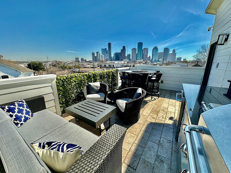 ENTERTAINERS DREAM HOUSE! Uniquely offering both private side yard and Roof deck with unobstructed stunning Downtown view, modern corner 3-bedroom, 3.5 bathroom 4-stories house. Rooftop equipped with a recently built gourmet kitchen with new gas grill, side burner and refrigerator for entertainment time with an amazing downtown view. The first-floor bedroom with full bathroom and walk-in closet creates a very private setting. The second floor offers an open concept layout of kitchen, dining room with bar and living room opening to an east facing balcony. The third floor is designated for the main bedroom suite with spacious walk-in closet, main bathroom with glass walls shower and soaking tub, laundry closet for full sized washer and dryer, secondary bedroom with full bath and walk-in closet. The fourth floor in addition to the rooftop offers ample storage space. Minutes away from Houston downtown, well connected with all main highways yet in quiet and walkable neighborhood with various breweries and restaurants, as well as proximity of bike paths and Bayou for outdoor sports. Comes unfurnished. Renter is responsible for all utilities (water, gas, electricity). Smoking is not allowed. Small pets (up to 20lbs) allowed. Deposit and first month rent due at signing, subsequent rents due by the 2nd of each month.