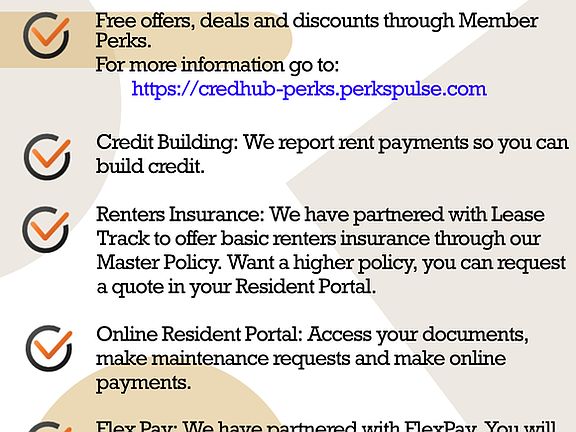 A Resident Benefit Package that includes credit building and liability insurance and resident discounts from local vendors.