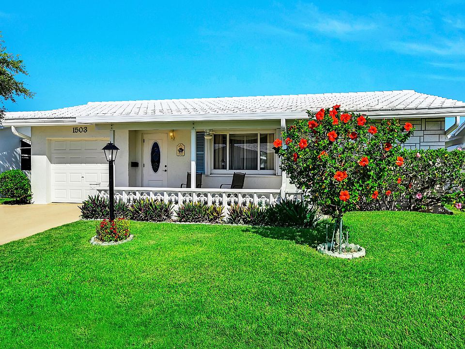 Lovely expanded challenger with water views.Paid up recreation lease in full. Roof replaced in 2018. Windows replaced plus accordion shutters. Neutral tile thru out. Kitchen cabinetry all replaced with updated appliances. Front porch has insulated aluminum roof and back patio has electric awning. Both baths totally updated. Hurricane Impact front door. Paid up recreation lease in full. Free 18 hole golf, 3 clubhouses, 3 heated pools, bocce courts, Minutes to ocean beaches and shopping,