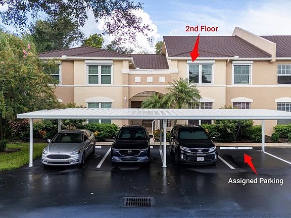 Welcome to your next home in beautiful Bridgeway of Parker Lakes, sought-after, gated community in south Fort Myers, FL! No CDD fees! Flood zone X - redesignated by FEMA recently! This beautifully updated 2nd floor unit, 2-bedroom + den, 2-bathroom condo offers 1,256 sq ft in this thoughtfully designed living space which has a great cathedral ceiling and convenient access to your parking spot underneath your carport. Enjoy Florida’s gorgeous weather and sunset from your screened-in lanai, complete with extra storage. Inside, you’ll find a spacious owner’s suite featuring a large walk-in closet with custom cabinets & shelves, six-foot vanity with granite countertops, towel closet and an updated shower. The upgraded kitchen boasts granite countertops and new stainless steel appliances making it a perfect kitchen for cooking and entertaining. Have peace of mind with ELECTRIC HURRICANE SHUTTERS (all windows and lanai), IMPACT RESISTANT WINDOWS and a BRAND-NEW METAL ROOF!! Additional highlights include tile flooring, ceiling fans and laundry room with washer & dryer. Bridgeway at Parker Lakes offers resort-style amenities, including a community pool, lap pool, spa tub, clubhouse, sports park, BBQ area, and playground. Ideally located near Ft. Myers Beach, Sanibel, Lakes Park, shopping, dining, and the library, this home is a must-see! Don’t miss this opportunity—schedule your showing today!