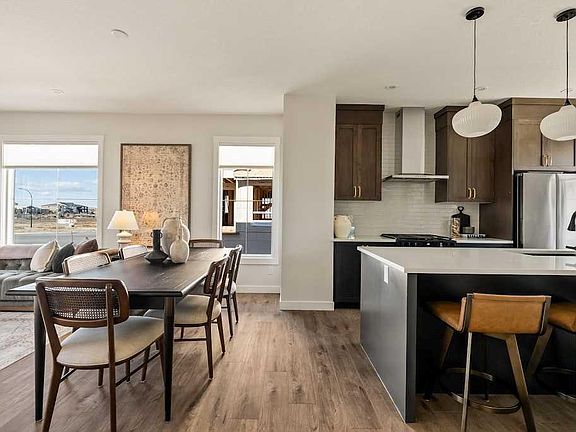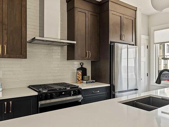 The brand new ‘Holiday’ model by Brookfield Residential is now available in the vibrant community of Livingston! This brand-new END-UNIT townhome blends contemporary design with everyday functionality, offering over 1,400 sqft, 3 bedrooms, 2.5 bathrooms, a ground-floor flex/office space, and a private double attached garage - all in one of north Calgary’s most desirable master-planned neighbourhoods. The open-concept main floor showcases a timeless kitchen featuring full-height cabinetry, elegant quartz countertops, a built-in hood fan and microwave, and a premium stainless-steel appliance package. The oversized island with pendant lighting provides the perfect place for casual dining or entertaining. The kitchen flows seamlessly into the bright living and dining areas, highlighted by a wall of windows that flood the space with natural light. Enjoy extra windows and additional natural light - a perk of owning the end-unit townhome! Step out onto your private West-facing balcony - ideal for summer BBQs or a morning coffee while providing optimal sunshine all year long. A large laundry room with additional storage and a convenient 2-piece powder room complete the main level. The upper level features a spacious ~11’ x 12’ primary suite which includes a walk-in closet and a private ensuite with walk-in shower, offering a relaxing retreat at the end of the day. Two additional bedrooms and a full bathroom complete the upper floor, providing plenty of room for family, guests, or a home office. On the lower level, a versatile den off the entryway and private double attached garage offers endless flexibility - the perfect space for a home office, gym, or creative space. The private double attached garage keeps your vehicles warm and secure all year long. This home includes numerous upgrades such as central A/C rough-in, a BBQ gas line + gas line to the kitchen range, 42” upper cabinets, and an enhanced interior selections package. Backed by both Brookfield’s comprehensive builder warranty and Alberta New Home Warranty, this property offers complete peace of mind. Set in Livingston, a dynamic north Calgary community known for its impressive Homeowners Association, state-of-the-art Hub facility, parks, playgrounds, and convenient access to major routes - this is the perfect place to call home. If you’re looking for a low-maintenance townhome that combines style, functionality, and quality craftsmanship - welcome to the Holiday by Brookfield Residential in Livingston. *Please note: Photos are for representation purposes only and exact finishes may vary.