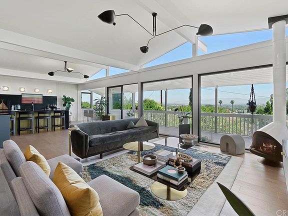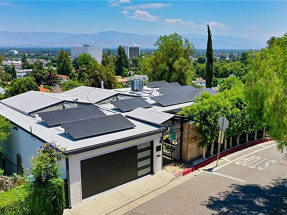 Surrounded by 180 degree mountain views, this turnkey mid-century masterpiece was artfully remodeled by a celebrity designer using high end finishes and attention to detail throughout. Nestled in the Sherman Oaks hills, this private two story home provides the perfect resort-like grounds for entertaining. Swimming pool is surrounded by lush landscaping including fruit producing trees (avocado, lemon, apple, persimmon) grassy lawn and expansive multi-tiered deck for optimal entertaining. Traditional mid-century entrance has a private seating area with koi pond, grape vines and separate entrance to the bedroom wing. Designer Kitchen with soapstone counters and state of the art JennAir appliances (including built in coffee maker, double ovens, convection microwave, Wine Fridge and Beverage center) in an open floor plan to expansive views. Wide-planked, oak hardwood floors throughout the home offer a stylish ambiance to the interior. Owned Solar Panel System with 2 Tesla back up batteries that provide power for the next 20 years for complete off the grid living. The private entry lower-level suite outfitted with a kitchenette offers unique possibilities for the homeowner, and is currently used for home theater and office. The excellent location of this residence, in close proximity to major freeways, also offers wonderful amenities such as unique dining, exceptional shopping, and quality schools, enjoyable from the privacy of your own retreat.