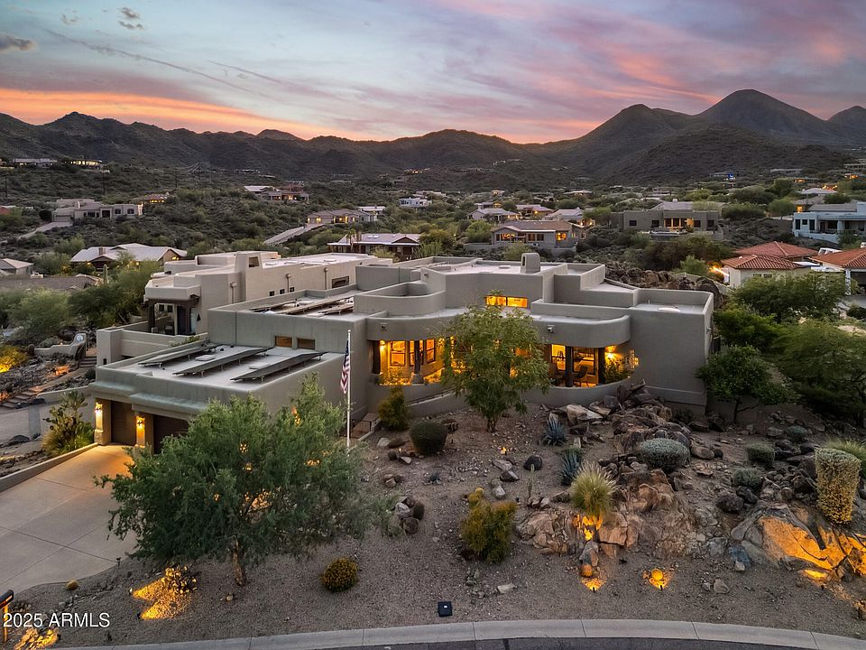 Prepare to be captivated by panoramic mountain views and iconic Arizona sunsets from this exceptional territorial-style home, perfectly perched on an elevated .83-acre lot in the prestigious North Heights community of Fountain Hills. Tucked away on a quiet cul-de-sac and backing to a natural desert wash with no rear neighbors, this home offers true privacy and a peaceful desert setting. Inside, the spacious great room features soaring ceilings, Viga beams, a classic bee-hive fireplace, and Saltillo tile flooring with charming Southwestern inlays. A wall of windows fills the home with natural light and frames the breathtaking views. The open layout connects the living, dining, and kitchen areas—ideal for both everyday living and entertaining. The kitchen boasts granite countertops, a large island, double ovens, and generous cabinetry, with direct access to the resort-style backyard complete with a sparkling pool, spa, and multiple patios to enjoy the outdoors.