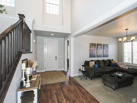 Welcome to this meticulously crafted luxury residence perched on a beautifully landscaped corner lot in sought-after Herriman. With breathtaking, uninterrupted views of the Salt Lake Valley, this home offers high-end living across three fully finished levels with thoughtful design and premium finishes throughout. The main level features soaring 20-ft lofted ceilings, a striking catwalk, and expansive open-concept living. The heart of the home includes a chef-inspired kitchen with custom wood-wrapped hood vent, matte honed 2" quartz countertops, a breakfast nook, formal dining room, and a spacious great room. The dedicated home office with coffered ceiling adds both function and elegance. The owner's suite is a true retreat with a soaker tub, stand-up shower, and double vanity. Also on the main level: a half bath, full laundry/mudroom, and 99-inch doorways throughout for an elevated sense of space. The fully finished basement boasts 10-ft ceilings, dry cold storage a large living/rec area, two bedrooms, a bath, and three versatile storage rooms. A basement bedroom includes a secondary en-suite bath, making it ideal for multi-generational living. Additional features include: Extended 3-car garage with 18-ft single bay extension Lofted garage storage system + outdoor shed with loft Brand new Nuvo Manor water filtration & softening system Dual-zone HVAC, recessed lighting throughout, and Ivory Homes 10-year extended structural warranty. This home combines timeless design with modern luxury, all set in a prime location with unmatched views. Schedule your private showing today and experience Herriman luxury living at its finest.