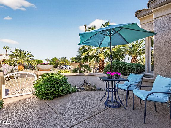 Enjoy indoor and outdoor living in this gorgeous upgraded home! Backyard oasis with pebbletec pool, extended patio w/epoxy coating, privacy screen, & lush vegetation including 2 pineapple palms that give it a resort feel. A front courtyard greets guests and leads into the home w/20'' tile on the diagonal & lg windows that show off the backyard. Kitchen has Quartz counters, glass tile backsplash, SS appliances , & white/gray cabinets w/pull-out drawers. Primary bdrm offers a bay window & 2nd bedroom has new carpet in 2025. Den has luxury vinyl floor and offers space for another sleeping room. Inside laundry w/cabinets, folding counter & sink. Garage w/cabinets, NEW HVAC & Water Heater in 2023, & New Opener in 2025. Some furniture available outside escrow. Put this one on your must see list!