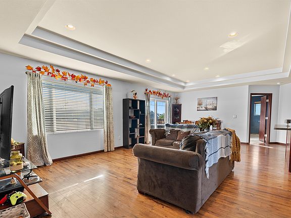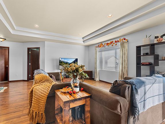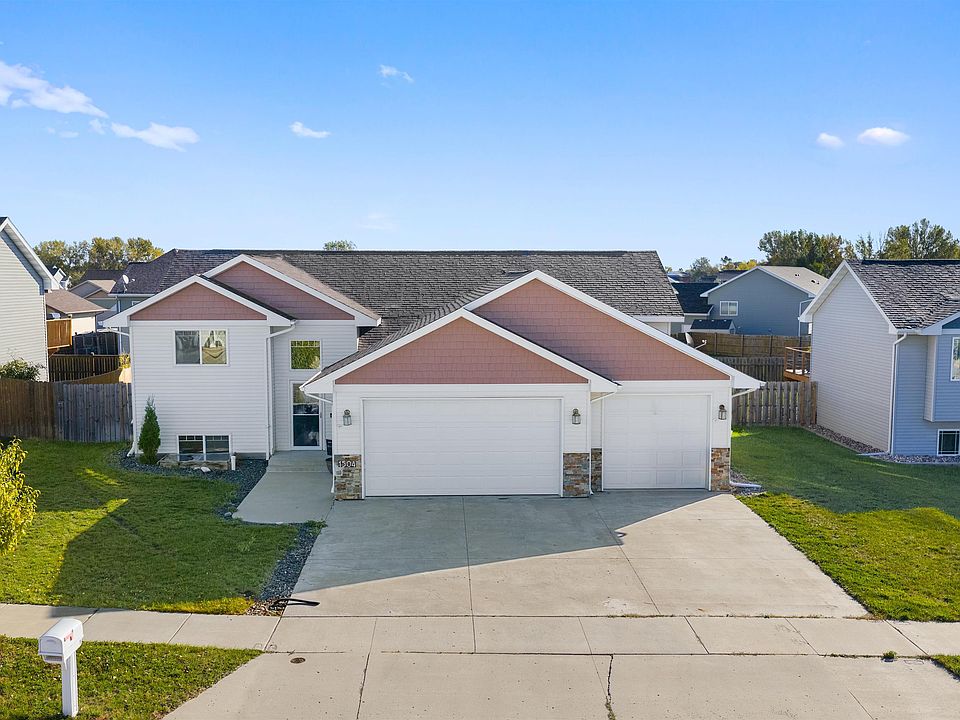 This Stunning 5 bedroom home sprawls across almost 2,900 square feet and is located in Minot's popular Eagles Landing Development!!! The main level has 3 bedrooms with 1 3/4 bathrooms and a beautiful kitchen with Cherry stained cabinets and upgraded stainless steel appliances! The main level living room has a recessed ceiling with recessed lighting and open to the kitchen and dining area. Just off the dining area is a large deck over-looking the backyard. The lower level provides an additional large living room with recessed lighting, 2 more bedrooms, a full bathroom, a bonus office/ hobby room, a laundry room with cabinets and utility room with storage. The 3 stall attached garage is heated, has a floor drain, hot & cold water spigots and also hanging shelves for extra storage!