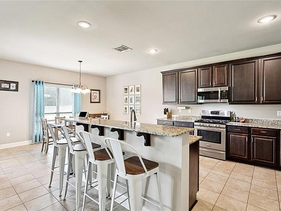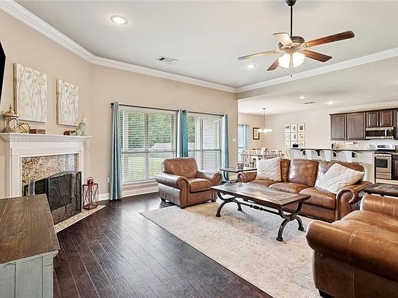 The open-concept living and kitchen areas are ideal for modern living and entertaining. The living room features warm wood flooring, a cozy fireplace, and ample natural light, creating a welcoming atmosphere. The adjacent kitchen boasts rich, dark cabinetry, granite countertops, and stainless steel appliances, all centered around a functional island with a breakfast bar. A separate dining area provides a perfect spot for family meals.