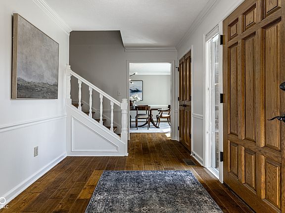 Tucked away on a quiet cul-de-sac in highly sought-after Woodgate in east Carmel, this stunning home sits on a picturesque one-acre lot with serene water access. Enjoy peace and privacy in a park-like setting, all while being just minutes from top-rated schools, shopping, and dining. Step inside to a spacious main level featuring a private office/den, formal dining room, and an updated kitchen that will impress even the most discerning cook. The kitchen boasts suede-finish quartzite countertops, stainless steel appliances, a generous center island, and opens seamlessly to a cozy great room with fireplace and an inviting breakfast area. Upstairs, the expansive primary suite offers an oversized bath with vaulted ceilings and ample closet space. Three additional bedrooms and a full bath complete the upper level. The finished basement is perfect for entertaining with a large open layout and custom wet bar. Step outside to a beautiful screened-in porch overlooking the tranquil backyard and private pond-your own outdoor retreat. With timeless charm and modern updates throughout, this home blends comfort, style, and an unbeatable location.