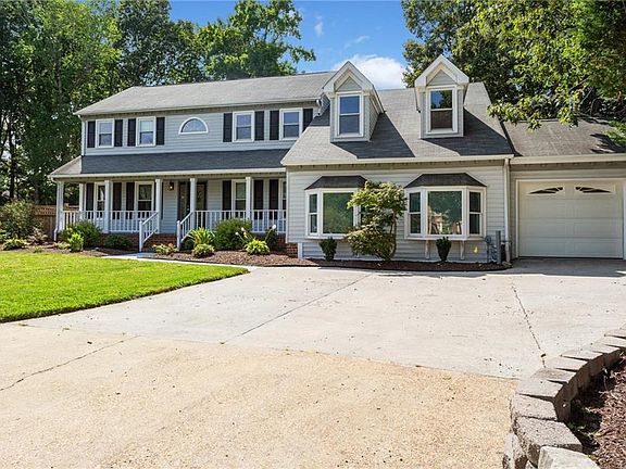 Beautiful 4 bed, 2.5 bath home in a cul-de-sac, 3 miles from Regent Univ. & I-64. Upgraded kitchen w/ new appliances. Dining room w/ crown molding, breakfast nook w/ new sliding glass patio doors & built-in blinds. New decks, arbor swing, & 4-season sunroom surround a large inground pool. Sunken game room features a billiards table, stained-glass light, 2 flat-screen TVs, mini-bar, separate HVAC, & storage. Single car garage w/ shelves & attic storage. Great room w/new flooring, gas fireplace, custom blinds, & smart 65" curved TV. Primary bedroom w/ walk-in closet, jetted tub, custom blinds, new skylight, faucets, & light fixtures. 3 additional bedrooms, 2 w/ attic spaces, Roof & HVAC approx 5 yrs old. 3,212 sq. ft., beautifully landscaped & move-in ready with so many extras that convey including 3 TVs, pool table, washer/dryer, appliances, fans, shed, pool cover, arbor swing, & more.